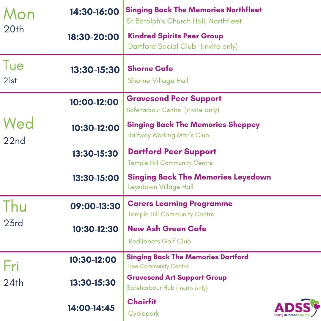 To book your place at one of our wellbeing groups, please call us on 01474 533990 or email us at info@alz-dem.org.
