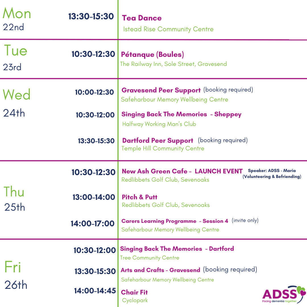 To find out more information about our wellbeing groups, please call us on 01474 533990 or email us at info@alz-dem.org.