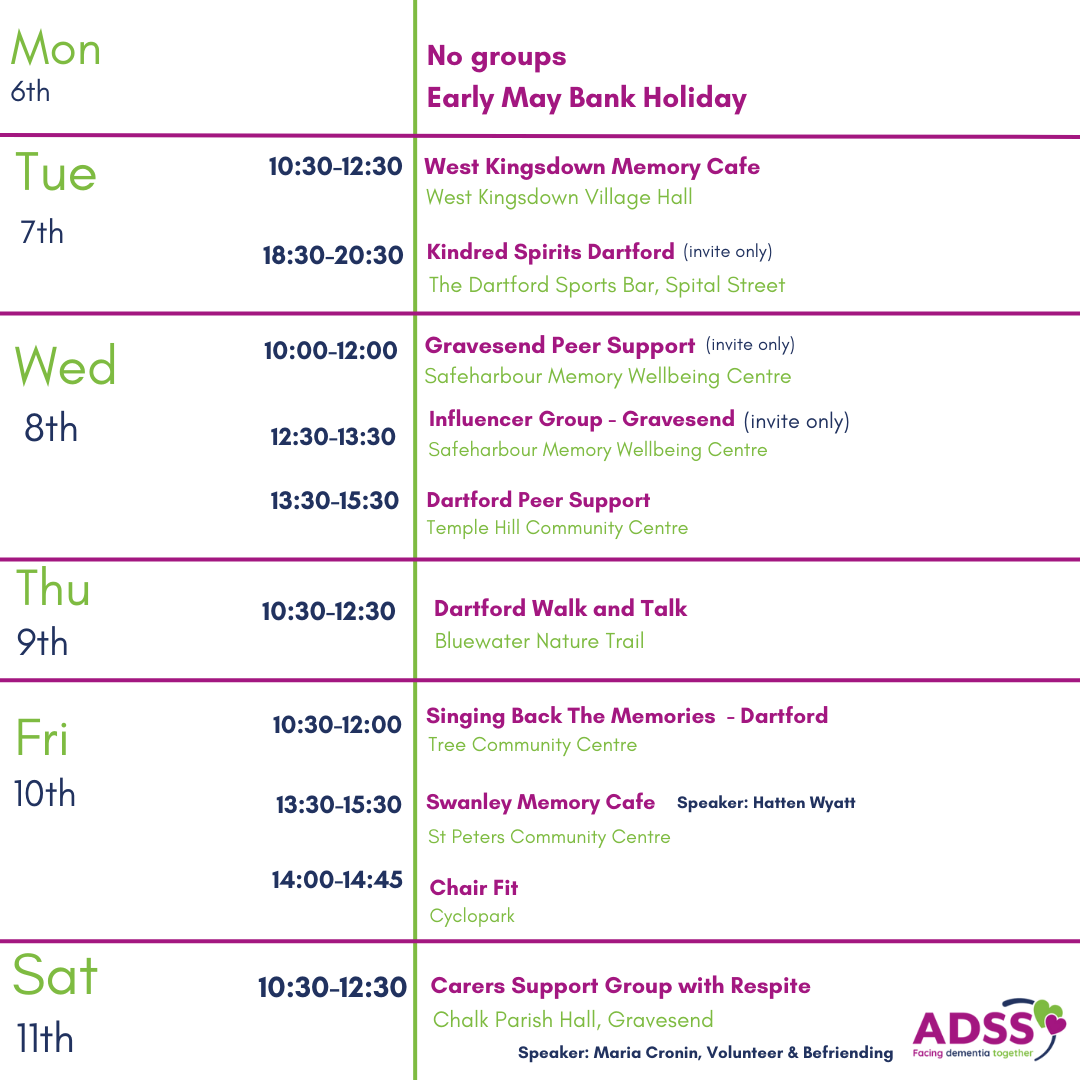 To find out more information about our wellbeing groups, please call us on 01474 533990 or email us at info@alz-dem.org.