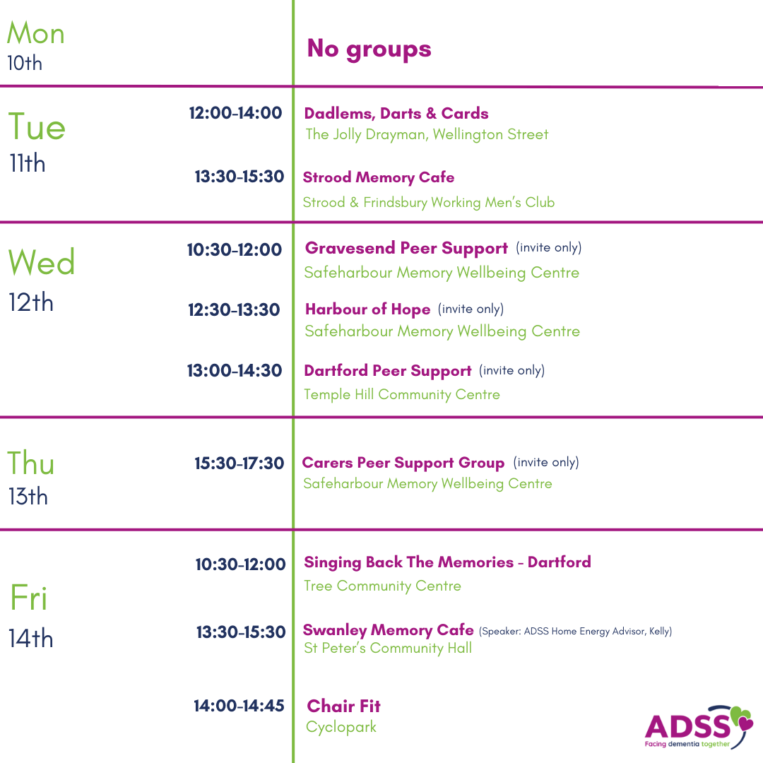 To find out more information about our wellbeing groups, please call us on 01474 533990 or email us at info@alz-dem.org.