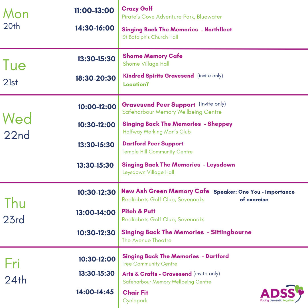 To find out more information about our wellbeing groups, please call us on 01474 533990 or email us at info@alz-dem.org.