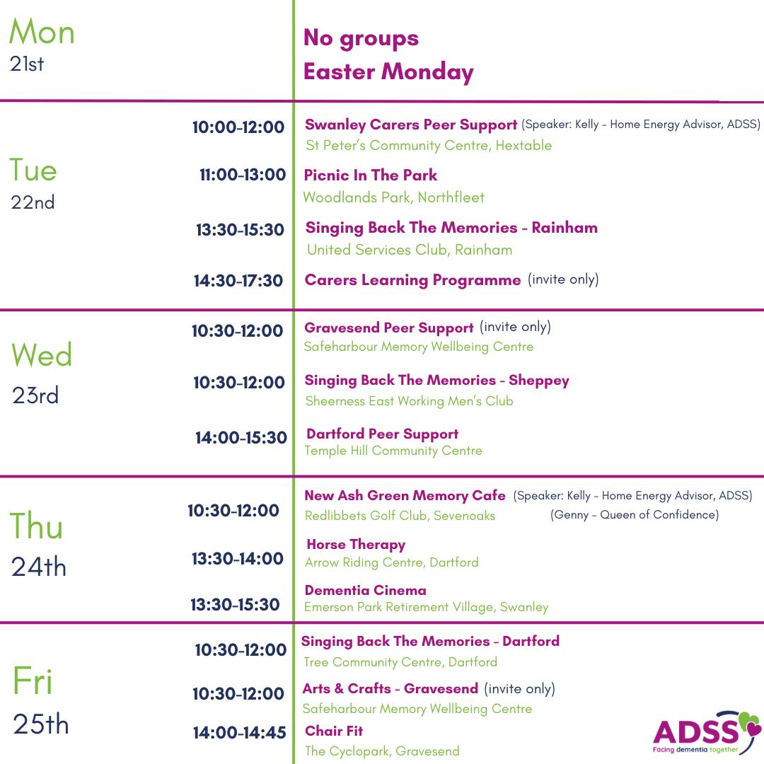 To find out more information about our wellbeing groups, please call us on 01474 533990 or email us at info@alz-dem.org.