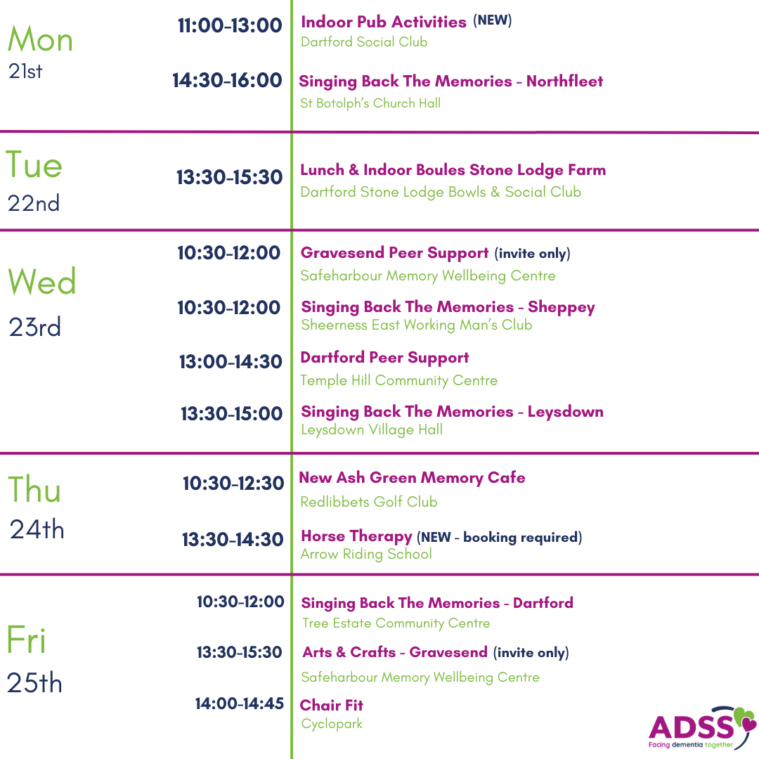 To find out more information about our wellbeing groups, please call us on 01474 533990 or email us at info@alz-dem.org.