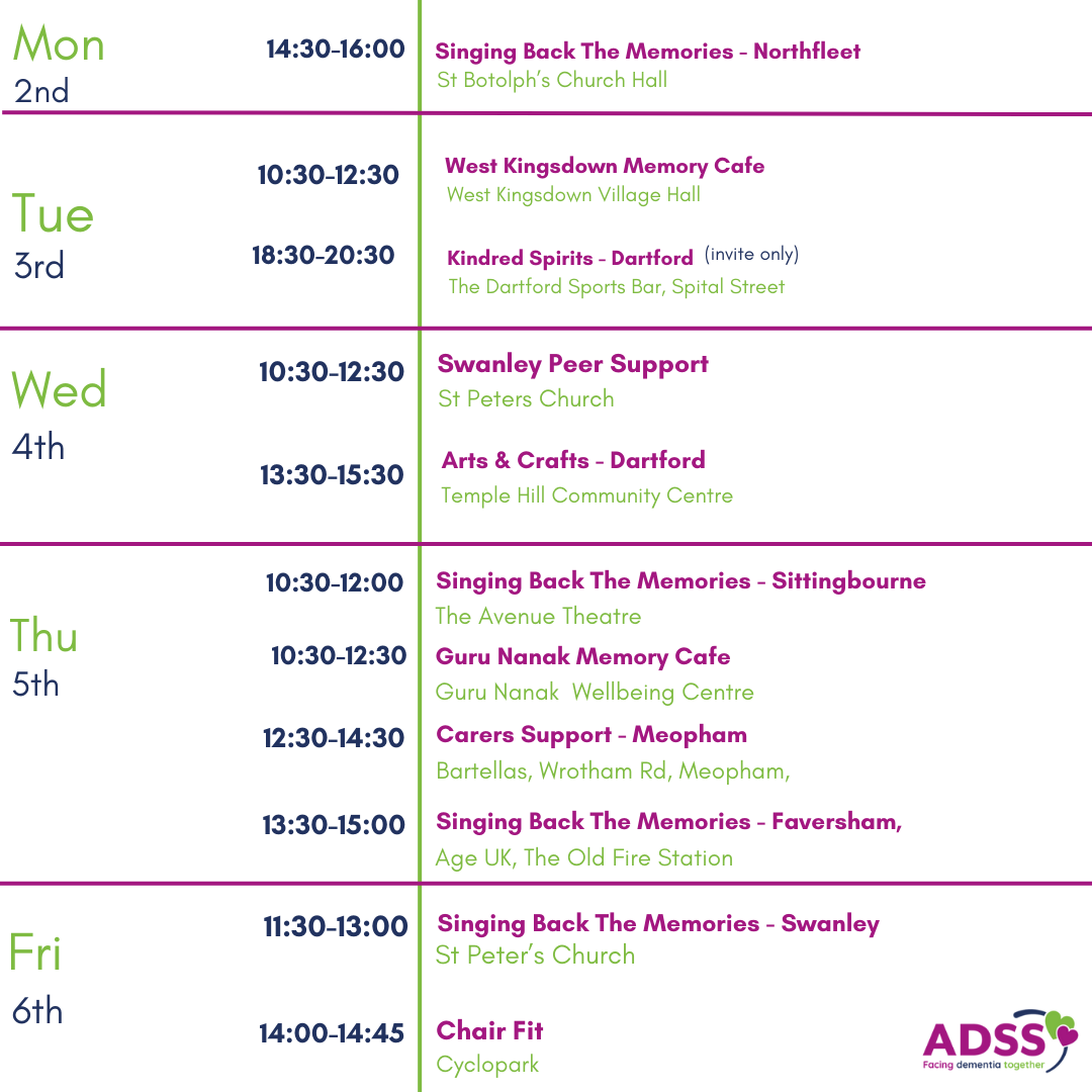 To find out more information about our wellbeing groups, please call us on 01474 533990 or email us at info@alz-dem.org.