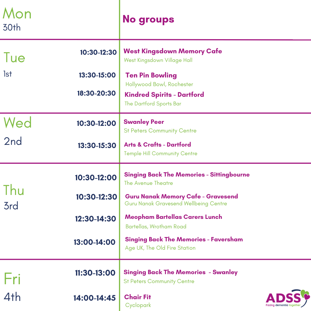 To find out more information about our wellbeing groups, please call us on 01474 533990 or email us at info@alz-dem.org.