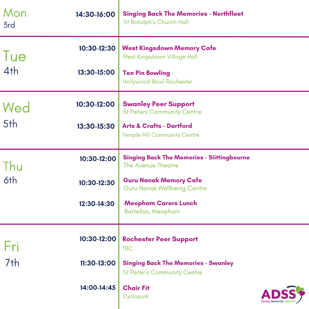 To find out more information about our wellbeing groups, please call us on 01474 533990 or email us at info@alz-dem.org.