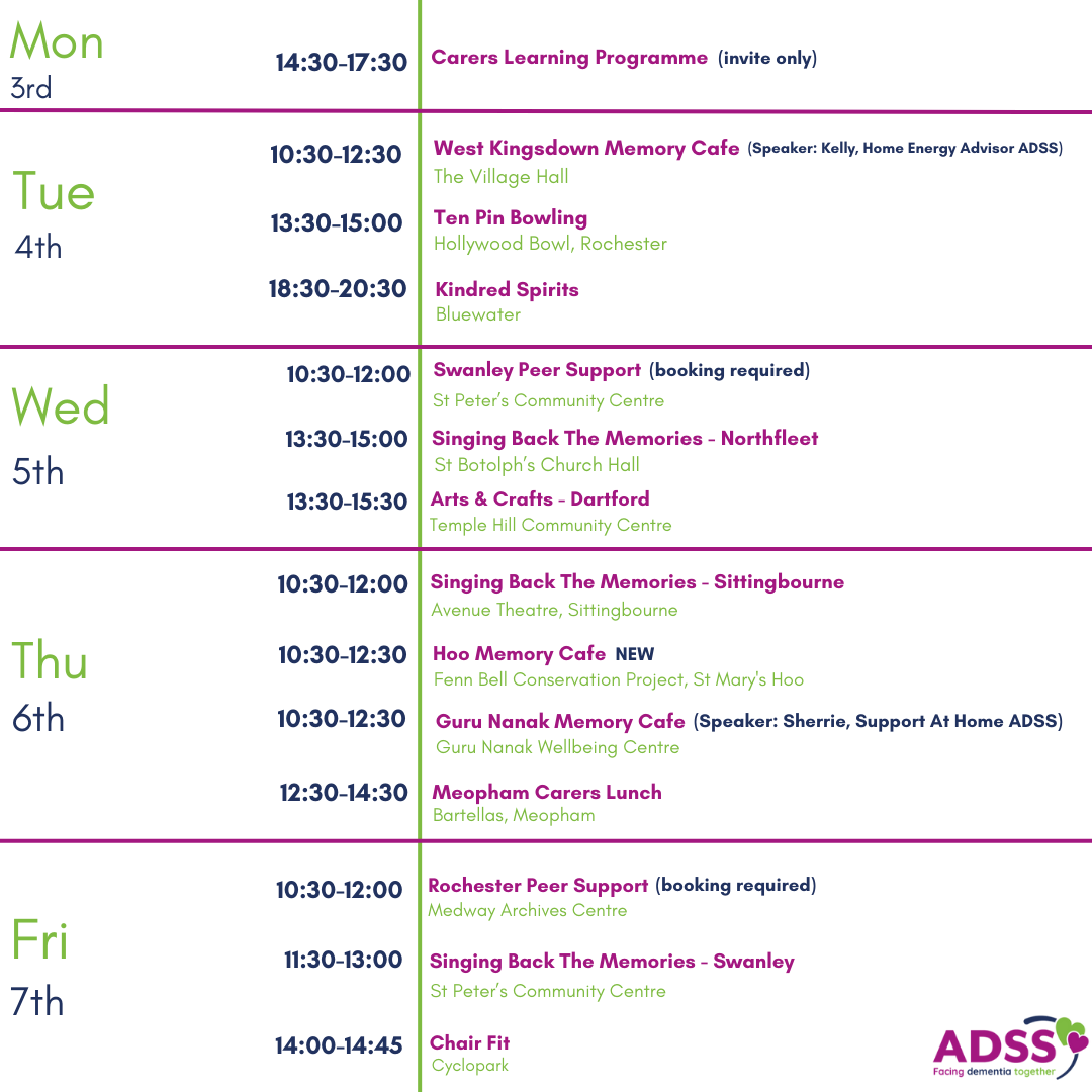 To find out more information about our wellbeing groups, please call us on 01474 533990 or email us at info@alz-dem.org.