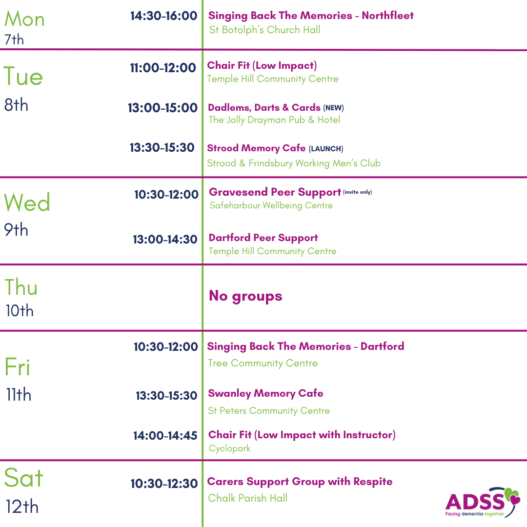 To find out more information about our wellbeing groups, please call us on 01474 533990 or email us at info@alz-dem.org.